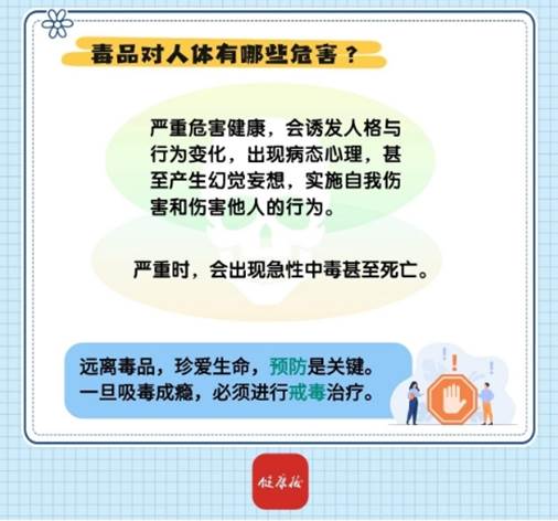 毒品严重危害健康,会诱发人格与行为变化,出现病态心理,甚至产生幻觉妄想,实施自我伤害和伤害他人的行为。严重时,会出现急性中毒甚至死亡。一旦吸毒成瘾,必须进行戒毒治疗。
