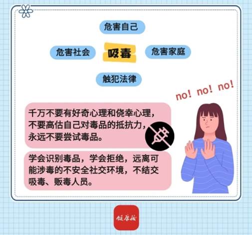 吸毒危害自己、危害家庭、危害社会、触犯法律。千万不要有好奇心理和侥幸心理,不要高估自己对毒品的抵抗力,永远不要尝试毒品。