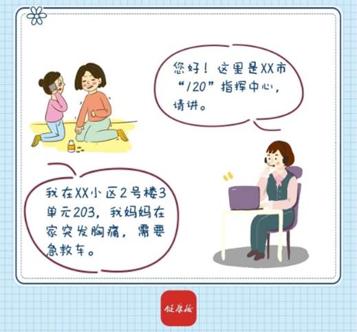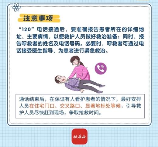拨打120急救电话求助,电话接通后,要准确报告患者所在的详细地址、主要病情,以便救护人员做好救治准备;同时,报告呼救者的姓名及电话号码。必要时,呼救者可通过电话接受医生指导,为患者进行紧急救治。通话结束后,应保持电话畅通,方便救护人员与呼救者联系。在保证有人看护患者的情况下,最好安排人员在住宅门口、交叉路口、显著地标处等候,引导救护人员尽快赶到现场,争取抢救时间。
