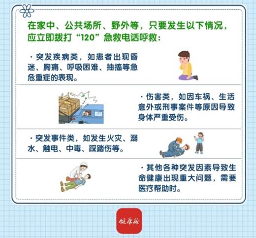 在家中、公共场所、野外等,只要发生以下情况,应立即拨打120急救电话呼救:突发疾病类,如患者出现昏迷、胸痛、呼吸困难、抽搐等急危重症的表现;伤害类,如因车祸、生活意外或刑事案件等原因导致身体严重受伤;突发事件类,如发生火灾、溺水、触电、中毒、踩踏伤等;其他各种突发因素导致生命健康出现重大问题,需要医疗帮助时。