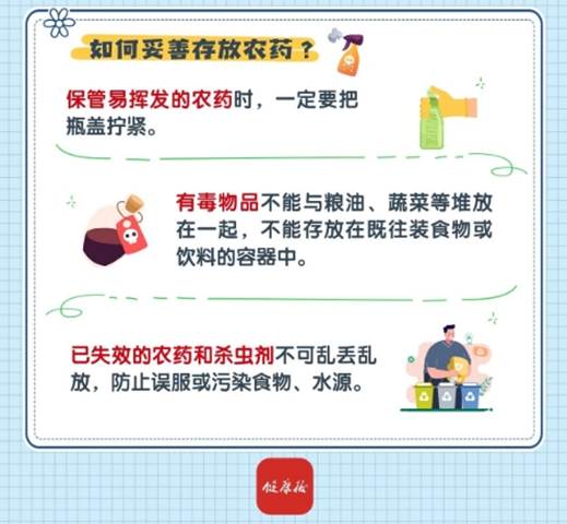 保管易挥发的农药时,一定要把瓶盖拧紧。有毒物品不能与粮油、蔬菜等堆放在一起,不能存放在既往装食物或饮料的容器中,以免发生误服中毒。已失效的农药和杀虫剂不可乱丢乱放,防止误服或污染食物、水源。