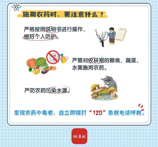 施用农药时,要严格按照说明书进行操作,做好个人防护。严禁对收获期的粮食、蔬菜、水果施用农药。严防农药污染水源。