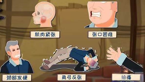 典型症状为苦笑面容、张口困难、牙关紧闭、角弓反张、抽搐,可因窒息或呼吸衰竭而死亡。早期症状为漏口水、出汗和易激动。