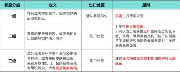 《狂犬病暴露预防处置工作规范(2023年版)》根据接触方式和暴露程度可将狂犬病暴露分为三级,对应的处置原则如下。