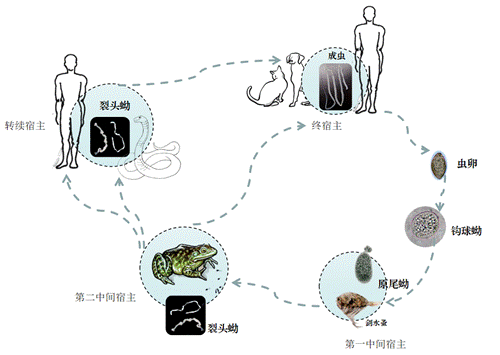 裂头蚴其生命周期涉及多个宿主。成虫在终宿主(如猫、犬)的小肠内产卵,卵随粪便排出体外后,在水中孵化出钩球蚴。钩球蚴被剑水蚤(第一中间宿主)吞食后,发育成原尾蚴。当剑水蚤被蝌蚪吞食,原尾蚴便进入蝌蚪体内,随着蝌蚪发育成蛙(第二中间宿主),原尾蚴也发育成裂头蚴。如果蛙被蛇、鸟类或猪等非正常宿主吞食,裂头蚴不能发育为成虫,而是在宿主体内继续生存。