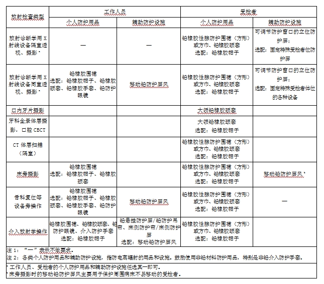 不同放射检查类型工作人员及受检者个人防护用品和辅助防护设施配置要求存在一定差异,详见下表。
