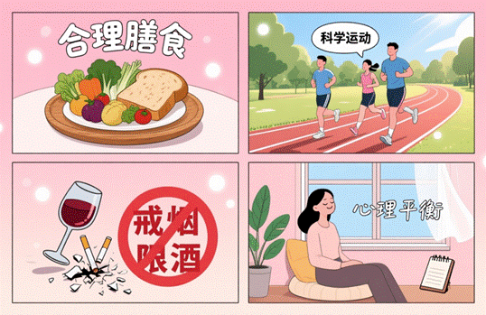 1、保持健康的生活方式:养成健康的饮食习惯、戒烟限酒、科学运动、保持健康体重和舒畅心情;