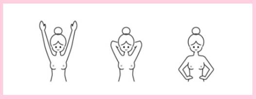 举起双臂,观察乳房皮肤有无异常:是否出现“酒窝征”(凹陷)、“橘皮样”改变(毛孔粗大)、红肿、溃烂。