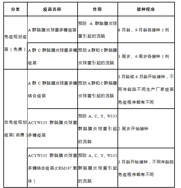 当前我国预防流脑的疫苗有免疫规划疫苗(免费)和非免疫规划疫苗(自费)两大类,共5种疫苗,具体见如下表格。
