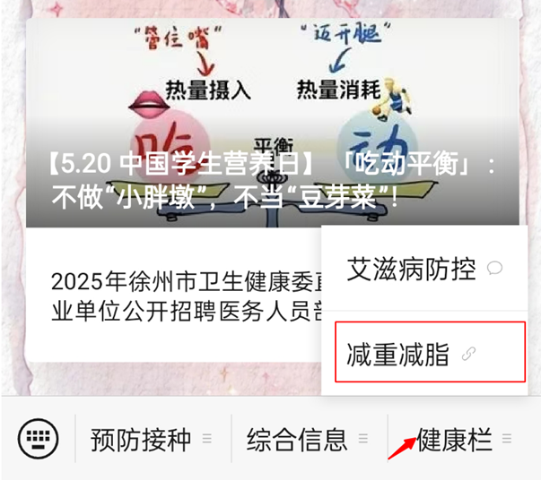 关注“徐州疾控”公众号,点击右下角健康栏里的“减重减脂”小程序。