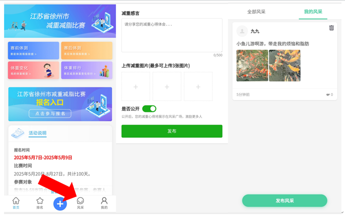 比赛期间,可以像发朋友圈一样,向参赛队友们展示您的风采。点击最下方的“风采”模块,编辑减重感言,添加图片,点击发布,可以选择公开或不公开,公开后,您的减重心得将展示在风采广场,激励更多队友前进!也可以受邀参与我们的减重减脂视频拍摄哟!