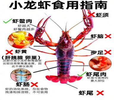 3、建议适量食用小龙虾,一次食用不要超过200g(带壳状态约为1斤),每周不超过2次。不吃虾头、虾黄,因为虾头更容易吸附蓄积重金属、毒素及细菌等污染物。