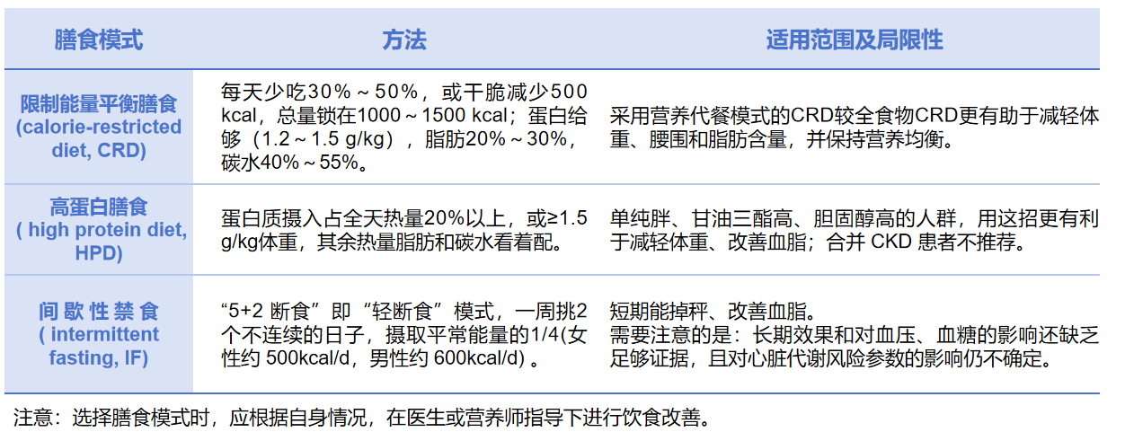 1.饮食:减重需制造“热量缺口”,每天减少500–750 kcal摄入,根据起始体重调整。最常见的3种膳食模式为: