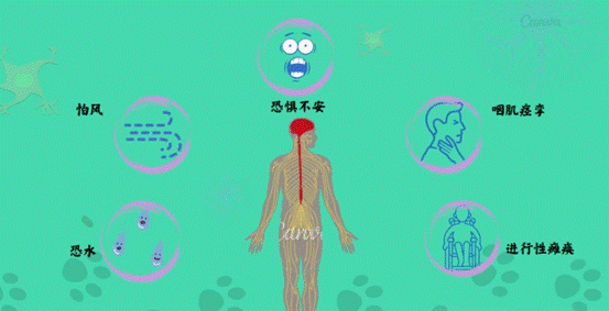 狂犬病通常分为“躁狂型”和“麻痹型”两种类型。狂躁型:大部分病人都是狂躁型,表现为极度恐惧、恐水、怕风、咽肌痉挛等。麻痹型:主要表现为肌肉瘫痪、意识模糊等,易被误诊或延误诊断。