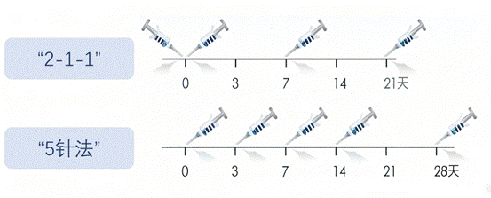 5针免疫程序:于暴露后第0(当天)、3、7、14和28天各注射狂犬病疫苗1剂次,共注射5剂次。