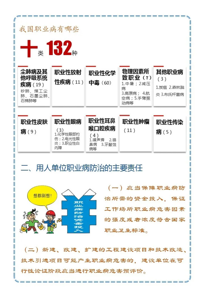 按照2011年12月31日施行的《中华人民共和国职业病防治法》的规定,职业病是指企业、事业单位和个体经济组织等用人单位的劳动者在职业活动中,因接触粉尘、放射性物质和其他有毒、有害因素而引起的疾病。根据2013年12月30日修订的《职业病分类和目录》它包括十大类,132种职业病,分别是: