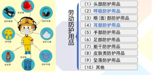 按使用功能又可分为头部防护用品、呼吸防护用品、眼(面)部防护用品、耳部防护用品、手部防护用品、足部防护用品、躯干防护用品、皮肤类防护用品、坠落防护用品、其他类等个体防护用品。