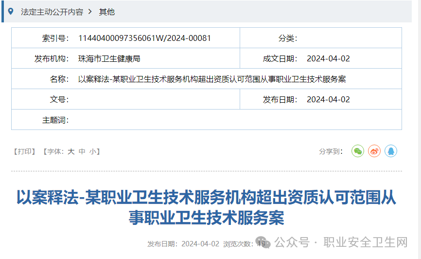 某职业卫生技术服务机构超出资质认可范围从事职业卫生技术服务的行为违反了《职业卫生技术服务机构管理办法》第二十九条第(一)项的规定,珠海市卫生健康局依据《职业卫生技术服务机构管理办法》第四十二条第(一)项的规定对该机构作出警告,并处5000元罚款的行政处罚。