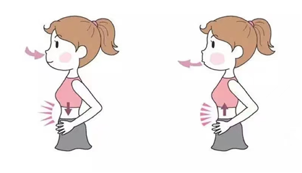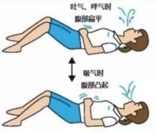 双手叉腰,拇指朝后、其余4指朝前。吸气和呼气时胸部均保持不动。吸气时4指对腹部稍加阻力,呼吸末时用力挤压腹部。呼气时还原腹部。