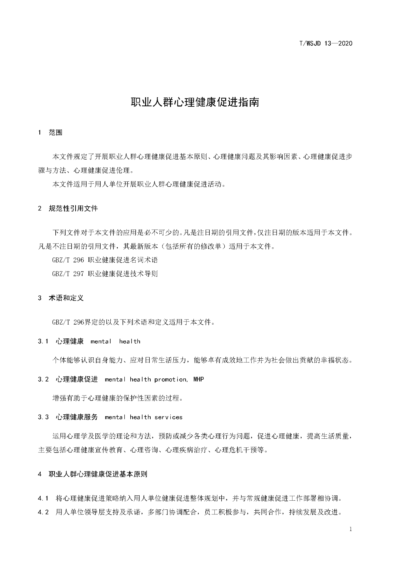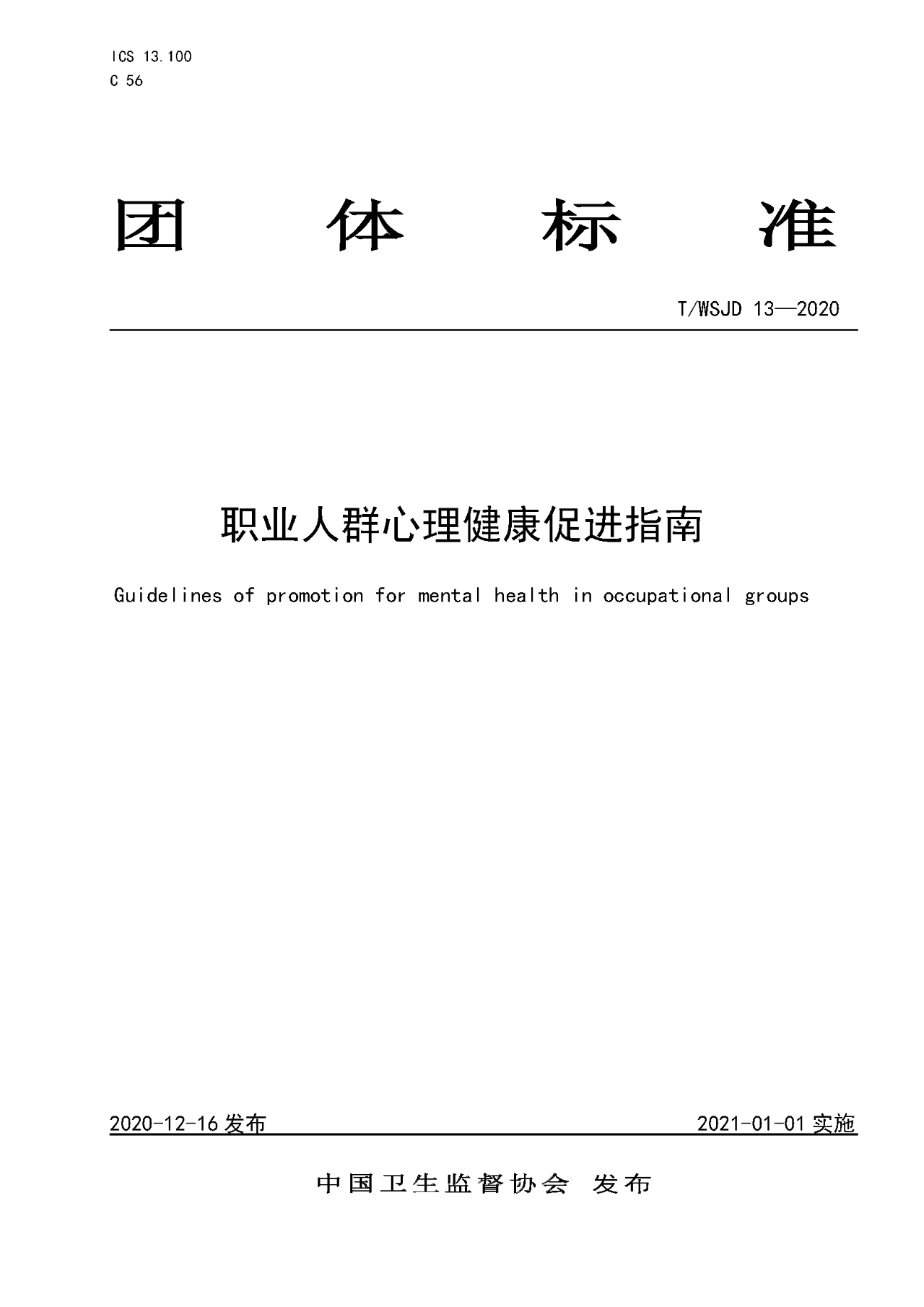 《职业人群心理健康促进指南》T/WSJD 13-2020