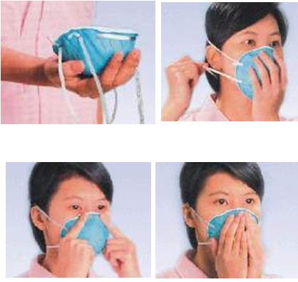 (1)将口罩罩住鼻、口及下巴,口罩下方带系于颈后,上方带系于头顶中部。
