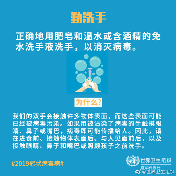 世卫组织专家:针对2019冠状病毒病,主要的防控的基本原则都是相似的,无论是在家里还是在办公场所,或者是在外面的一些人群聚集的场所,根据我们对这个病毒的了解,病毒的传播通常发生在封闭的通风不好的场或者是比较拥挤的场所,也就是人和人非常近距离地聚集在一起。一个通风环境好,人员聚集少的场所可以很大程度降低这种风险。此外,加上保持社交距离和经常洗手保持手部的清洁,综合运用前面提到的各种措施,我们就可以避免患上2019冠状病毒病。