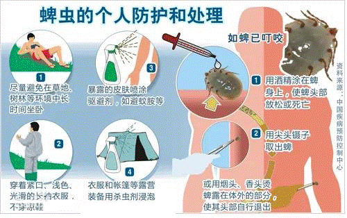 蜱虫叮咬可以用酒精涂在蜱身上,使蜱头部放松或死亡,再用镊子夹住蜱虫头部,切莫夹腹部,垂直向上拨出;或用烟头、香头轻轻烫蜱露在体外的部分,可使其头部自行慢慢退出。取出蜱虫后,再用碘酒或酒精做局部消毒处理,赶紧就医。拔下来的蜱虫可以用塑料袋或瓶子密封,万一伤口恶化,也能作为医生处理的参考。