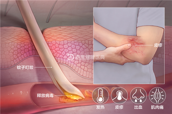登革热的潜伏期一般为3~14天,多数为5~8天。患者和隐性感染者是主要的传染来源。患者在发病前1天至发病后5天都具有传染性。典型的登革热病程分为3期,即发热期、极期和恢复期。典型的症状有:发热、皮疹、出血、全身淋巴结轻度肿大等。如被蚊虫叮咬,出现以下症状要警惕:
