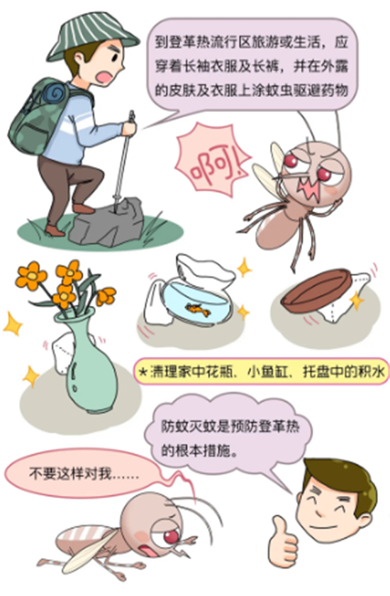 1.到登革热流行区旅游,因穿着长袖衣服及长裤,并在外漏的皮肤及衣服上涂蚊虫驱避药物。