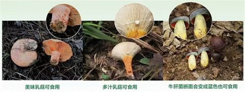 错!有不少毒蘑菇受伤后,不分泌乳汁,也不变色。而有的食用菌,比如松乳菇、红汁乳菇掰开后会流出乳汁,但却是美味的食用菌,一些可食用的牛肝菌断面会变成蓝色,也是可食的。