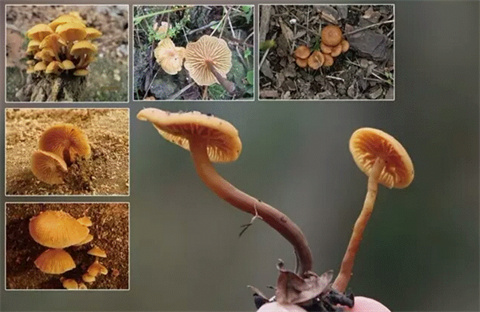 形态特征:子实体小。菌盖直径1-4.5cm,黄褐色至浅茶褐色,肉质薄如膜且有韧性,边缘更薄,可见菌盖下的菌褶的纹。菌褶稀,与菌盖同色;菌柄圆柱形或基部稍膨胀,实心,黄褐色至浅茶褐色。