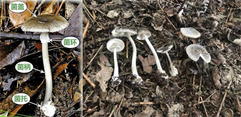 形态特征:子实体小型至中等。菌盖深灰色、暗褐色至近黑色。菌柄上部或顶部生有灰白色菌环,基部有白色近球状的菌托。