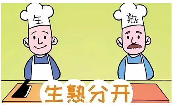 ②生熟分开:“生”是指还需要进行热处理的原材料,比如生肉、禽和生海鲜。“熟就是直接入口的食品。生熟分开就是避免生的食品上携带的致病菌污染到直接入口的食品,引起食源性疾病。除了将生熟食物分别存放在器皿内,避免互相接触。还要特别注意加工生熟食品的用具也要分开,例如刀具、砧板等;浸泡过生肉的水不要溅到烹饪过的和即食的食物上。