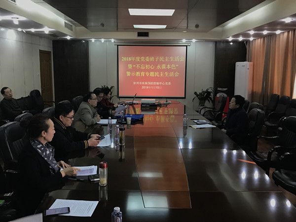 根据《中共中央纪委机关 中共中央组织部关于认真开好2018年度县以上党和国家机关党员领导干部民主生活会的通知》要求以及《“不忘初心永葆本色”警示教育月活动方案》(徐委办[2018] 223号)文件精神,市疾控中心于2019年1月15日下午在5楼会议室召开2018年度党委班子民主生活会暨“不忘初心 永葆本色”专题民主生活会。中心全体班子成员及市纪委第十纪检组副组长陈益胜参加会议。