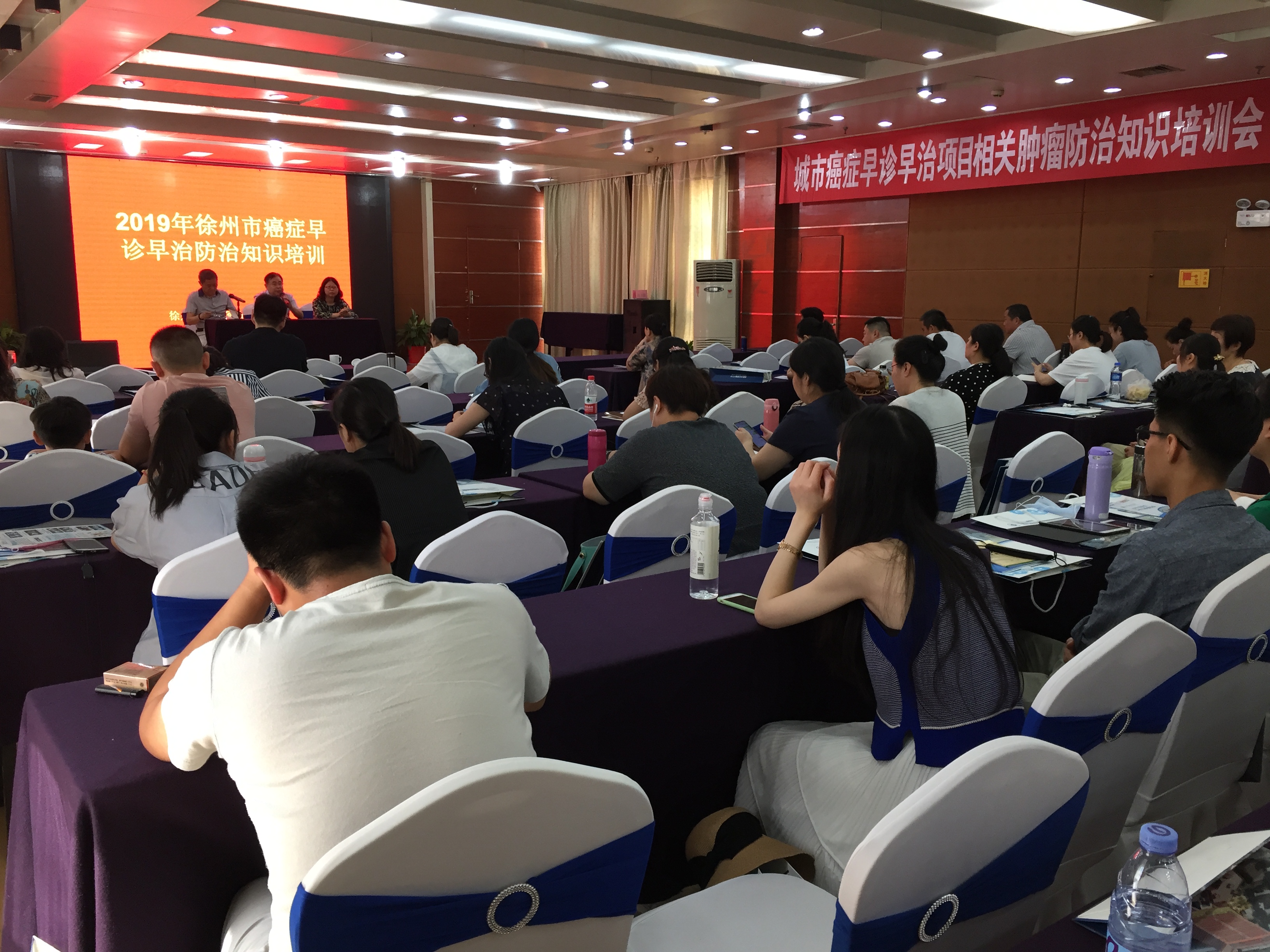 徐州市自2014年实施城市癌症早诊早治项目以来,累计筛查9万余人,体检2万人次,发现癌症早期病变2000多例,为保障徐州市居民健康做出了巨大贡献。为进一步做好城市癌症早诊早治工作,提高基层医务工作者的肿瘤防治水平,市疾控中心于2019年7月2日联合市肿瘤医院在徐州市金港大酒店举办城市癌症早诊早治项目相关癌症防治知识培训班。徐州市肿瘤医院副院长王健、徐州市疾控中心主任助理常桂秋、徐州市疾控中心慢病科科长娄培安、徐州市肿瘤医院肿防办主任董栋等出席会议。市疾控中心、市肿瘤医院项目相关人员,鼓楼区、泉山区、云龙区、贾汪区、开发区疾控中心及社区卫生服务中心项目工作参与人员共120余人参加了此次培训。