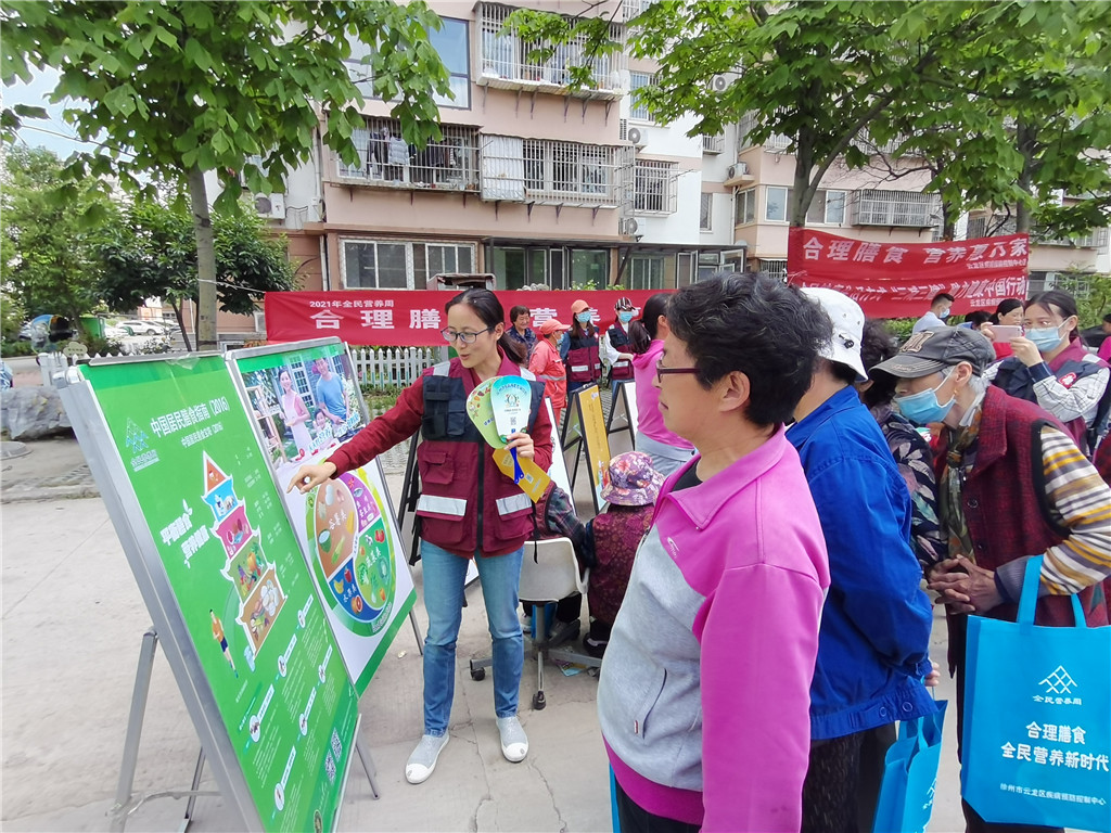 为贯彻落实《“健康江苏2030”规划纲要》和《江苏省国民营养计划实施方案2018-2030》,深入推进合理膳食行动。5月20日,徐州市疾控中心联合云龙区疾控中心走进云龙区骆驼山康馨园小区共同开展了以 “健康中国、营养先行”为宣传口号,“合理膳食、营养惠万家”为传播主题的全民营养周宣传活动。