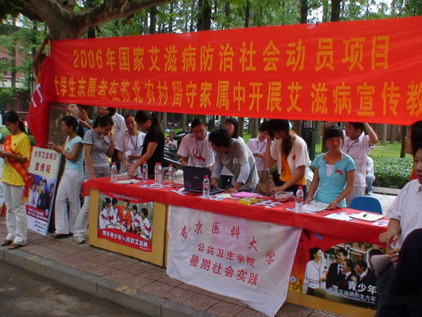 7月24日,南京南京医科大学预防医学专业大学生一行26人来邳州开展艾滋病宣传社会实践活动。这次活动的宣传主题为“撑起一片蓝天,让我们一起高飞”,活动选择在邳州市人流量较大的人民公园进行。在邳州市疾控中心的大专配合和帮助下,活动制作展示展板12块,发送各种宣传单、宣传册、宣传画约5000份。活动中,大学生充分发挥自己的专业特长,利用自己的专业知识和疾控中心专业人员一起给过往群众宣传艾滋病防治知识,现场接受群众咨询221人次。宣传活动取得了良好的效果。