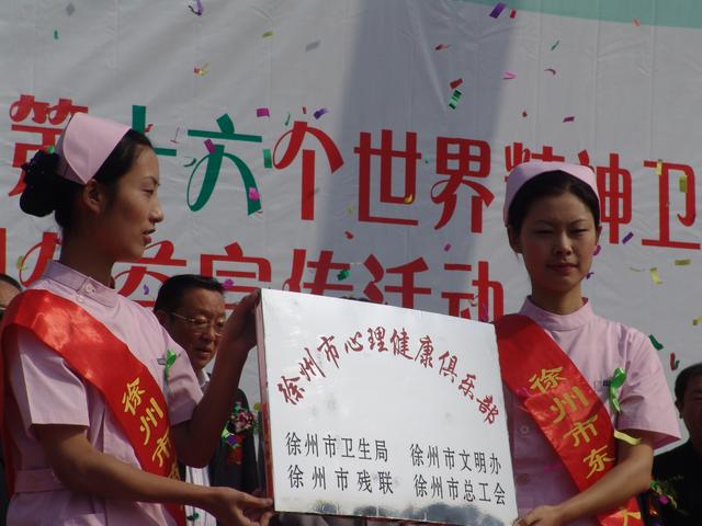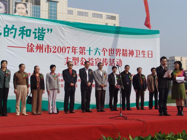 在秋高气爽,到处充满阳光、充满欢乐、充满收获的季节,我们迎来了第十六个“世界精神卫生日”。10月10日上午古彭广场歌舞喧天、人头攒动,大红色的拱门上印有今年“世界精神卫生日”的宣传主题:“提倡心理咨询,促进精神健康”矗立在广场中央;高4米、宽10米的大型宣传幕墙上绿丝带的徽章,在“心的和谐”四个大字的托映下格外醒目。依次整齐排开的精神卫生知识宣传展板通俗易懂、图文并茂吸引着现场市民的驻足观看。九点三十分,随着徐州人民广播电台主持人优美动听的现场直播和《爱的奉献》乐曲声,心的和谐--徐州市2007年“世界精神卫生日”大型广场宣传活动拉开了序幕。