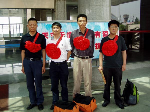 此次参加救援队伍的有徐州市疾病预防控制中心孙传武、葛小武;云龙区疾病预防控制中心的张侃侃;铜山县疾控制中心的许军。5月22日下午,四名同志在市卫生局副局长苗斌、市疾控中心主任张雷、云龙区疾控中心主任申涛、铜山县疾控中心主任韩令才等近领导和同事的欢送下离开徐州,以较快的速度赶赴灾区,市疾病预防控制中心副主任朱东全送四名同志到南京。