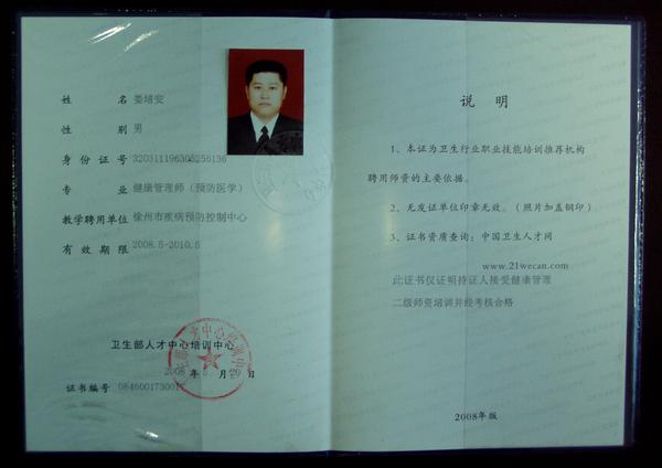 [组图]我中心慢病科娄培安科长获得卫生部颁发的健康管理师师资培训证书