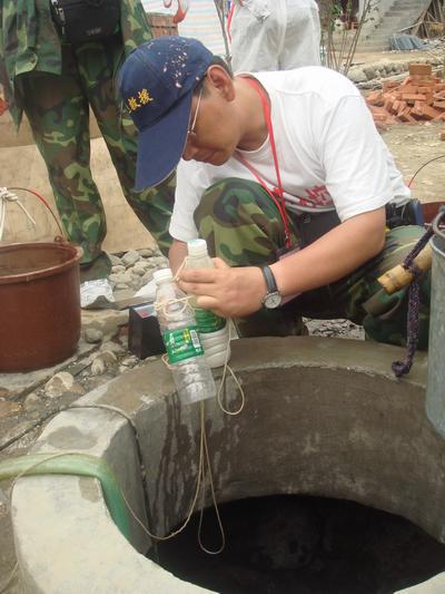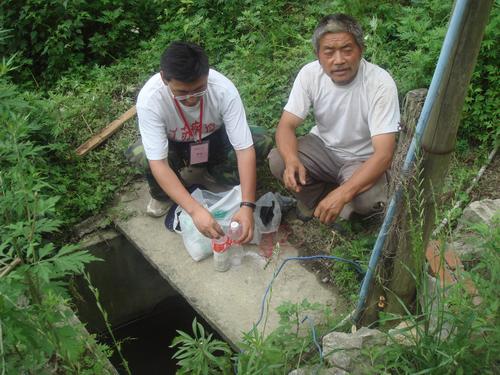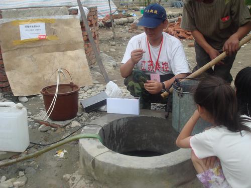 为避免安置群众因厌烦或遗忘而不进行饮水消毒,并减少投加消毒剂的次数,我们自制了简易缓释饮水消毒器,以使群众从水源取水直接符合国家饮用水卫生标准,并取得持续消毒效果。今天下午,我们通过检测游离性余氯,对前天投放的缓释持续饮水消毒器的消毒效果进行验证,并估测其消毒持续时间。经现场检测,两天后仍能保证足够的消毒效果,而消毒剂消耗量仅四分之一,即该消毒器消毒持续时间至少可在一周左右,从而避免了每次均需要对饮用水进行消毒的工作量。但消毒器瓶体上所钻小孔由于漂粉精反应生成的碳酸钙的沉积导致轻度堵塞,提醒我们应定期进行清理。我们已告知水井管理人员,每天检查消毒器一次,发现小孔堵塞及时清理,发现消毒剂耗尽立即更换,以确保对饮用水的消毒效果,避免水源性肠道传染病的流行。在工作过程中,听说建新村五队也有一水井作为饮用水水源,我们立即赶赴水井所在地。现场调查发现,该水井虽然水质较好,但井口无围护设施,周围杂草丛生,容易受外来污染物的影响。我们指导附近群众尽快对井口周围进行清理,保持环境卫生,并现场制作简易缓释消毒器投放水井中。然后进行游离性余氯检测,确认其消毒效果。同时将前述注意事项再次提醒安置群众,要求他们每天检查消毒器,确保其持续消毒效果。