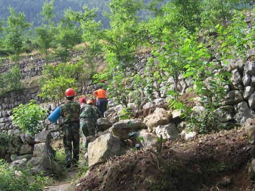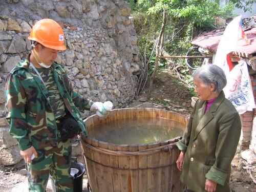 我们带着消毒药械,分成两组,在当地乡村医生的的带领下,顺着陡峭的山坡拾级而上,逐户走访,在家的山民大多是老人和孩子。在我们的走访中不断为北川人民抗震自救的能力和毅力所感动。擂鼓初中二年级的羌族小姑娘牟燕还没有复课,别看她小小年纪,却在洗着满满一大盆衣服。一位满头银发的老奶奶在倒塌的废墟周围搭起了帐篷忙前忙后,我们了解发给她的消毒片找不到了,就及时为她家里水缸里的饮用水投放了消毒片,并留给她一些,嘱咐她记得每天消毒。