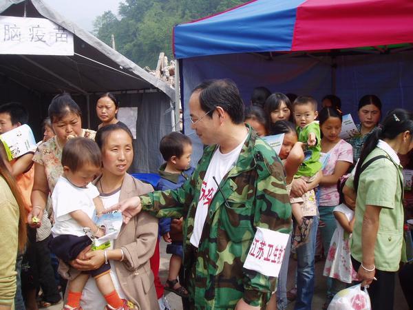因地震中断的免疫规划工作恢复开诊,图为开诊首日甲肝和乙脑疫苗的应急接种现场