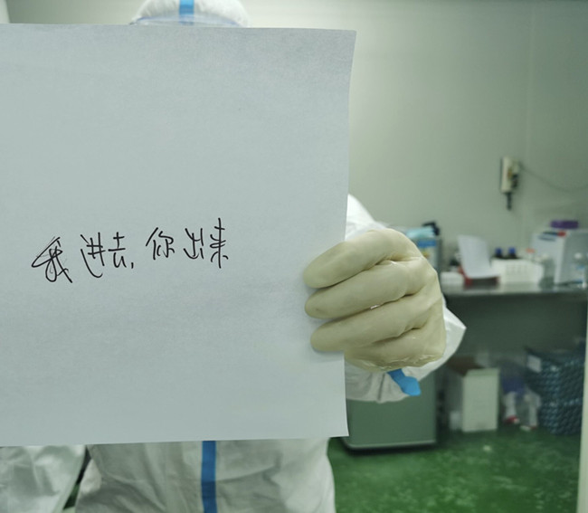 早晨6点钟,他又站在了实验室的门口,拿着牌子:我进去,你出来。继续工作。吃饭期间,满是血丝的眼睛,微笑告诉我们:你们不用担心,我坚持地住。