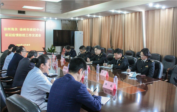 4月28日下午,徐州海关关长缪建军、副关长伊仰东一行5人来到徐州市疾控中心,座谈交流严防新冠疫情境外输入工作。中心党委书记李翔、副主任余加席、主任助理常桂秋及疾控科、检验中心、办公室负责同志参加活动。