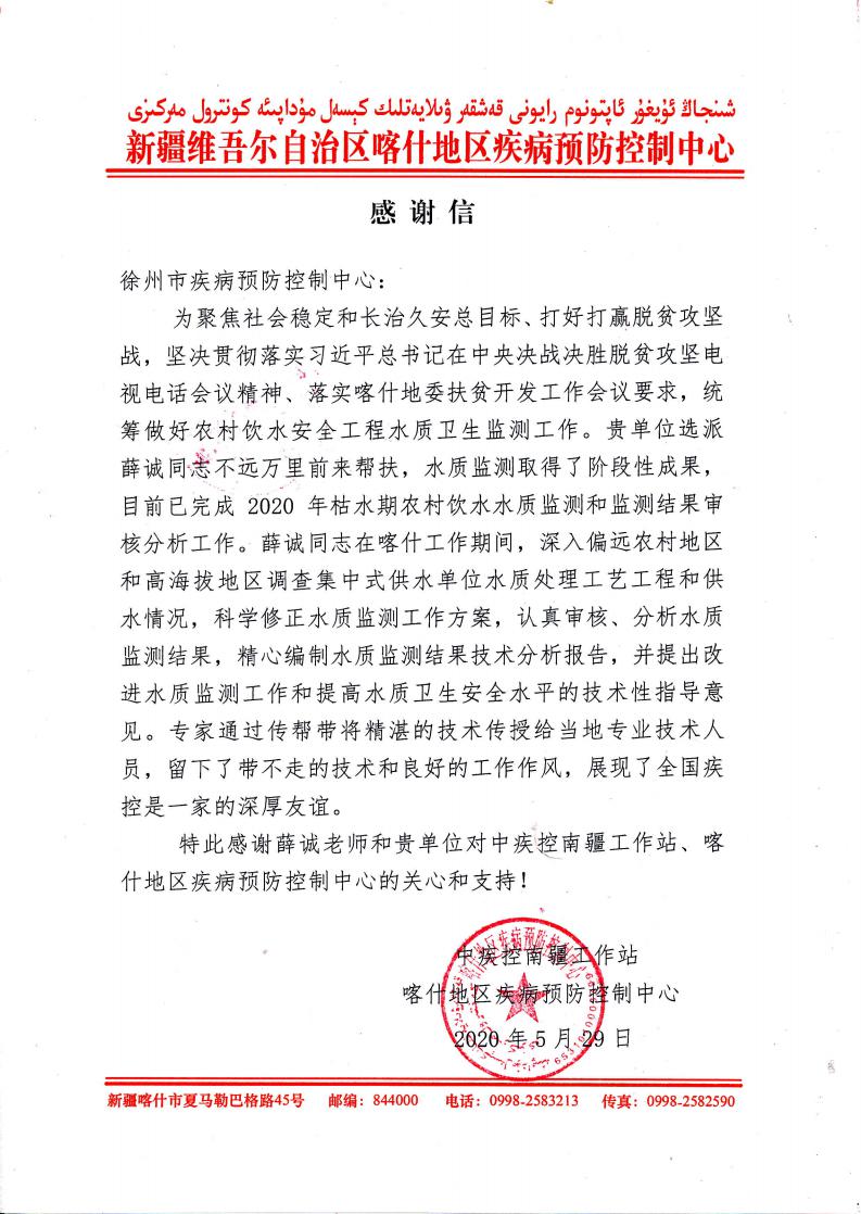 5月29日,中疾控南疆工作站、喀什地区疾控中心特意发函向徐州市疾病预防控制中心致谢。应中国疾病预防控制中心南疆工作站和喀什地区疾病预防控制中心的邀请,徐州市疾病预防控制中心选派卫生科科长薛诚同志于2020年5月8日前往喀什地区疾病预防控制中心,开展为期三周的援助农村生活饮用水水质卫生监测工作。