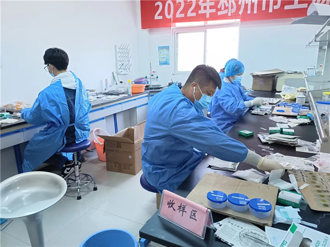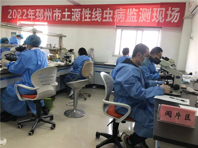 徐州市疾控中心于2022年10月31日-11月3日至邳州市开展现场调查工作。在项目开展前,徐州市疾控中心、邳州市疾控中心、镇卫生院三级联合广泛宣传土源性线虫病监测目的和意义,现场发放宣传折页,并耐心细致地向现场村民宣讲钩虫病、蛔虫病、鞭虫病、蛲虫病的危害、感染途径和防控等知识,提高群众配合积极性和主动性。现场粪检工作在邳州市疾控中心实验室开展,分别设置收样区、制片区、阅片区及样本收回区。收样区工作人员负责收集统计各乡镇粪样并进行统一编号;制片区工作人员按照改良加藤氏法要求进行制片;阅片区由专业镜检人员在低倍镜(10×)下镜检,仔细检查每一个视野;样本收回区工作人员负责实验后粪样、涂片统一回收,在徐州市疾控中心、邳州市疾控中心、乡镇卫生院工作人员共同参与下,共完成1000人份粪便样品采集、制片及镜检任务。