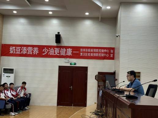徐州市疾控食品安全与学校卫生科副科长苗升浩向学生宣传有关奶豆制品摄入等营养日主题知识,同时对学生的近视防护有关知识进行了宣讲,通过课堂互动、奖励问答调动学生积极性,增强宣讲效果。同时活动现场,工作人员发放每日摄入及奶制品主题的宣传折页为学生正确选择摄入奶制品提供精准建议;通过讲解发放营养知识手册宣传减油、增豆、加奶关键知识,对实现健康生活目标具有重要意义;通过讲解平衡膳食宝塔模型并发放膳食宝塔宣传折页加深学生对合理膳食的掌握。