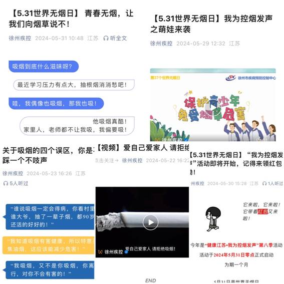 为了让大家更加了解烟草对健康的危害,减少青少年接触烟草,市疾控中心发布多篇控烟科普文章和科普视频,为公众讲解烟草的有害成分,吸烟,二手烟,三手烟的危害以及电子烟的风险等知识,同时号召大家积极扫码参与“健康江苏• 我为控烟发声“第八季活动。