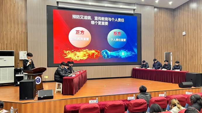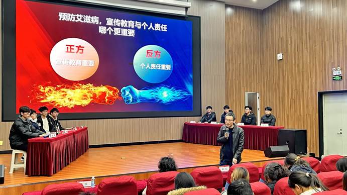 讲座结束后,一场激烈的辩论赛点燃了现场气氛。8名同学分成两组,围绕“艾滋病防控中宣传教育更重要还是个人责任更重要”展开交锋。正方辩手从“宣传教育是普及知识、消除歧视的基础”切入,强调只有通过广泛宣传才能让科学防艾理念覆盖更多人群;反方则以“个人是防控最后一道防线”为核心,论证规范自身行为、增强防护意识才是阻断传播的关键。精彩的辩论不仅展现了同学们的思辨能力,更让现场师生在思想碰撞中深刻认识到:宣传教育与个人责任并非对立,而是相辅相成、缺一不可的防艾关键环节。